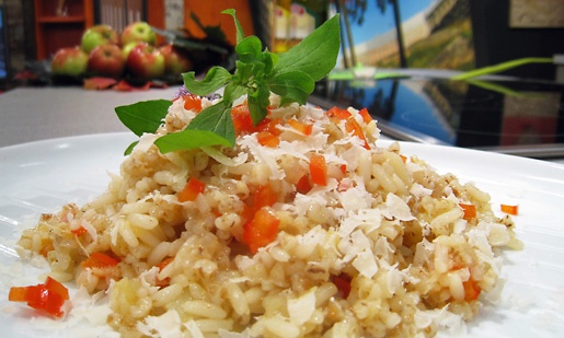 Kuumenna öljy pannulla ja kiehauta siinä sipulit ja chili. Lisää riisi ja anna lämmetä hetki. Mausta