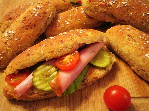Liuota hiiva kädenlämpöiseen veteen, lisää suola, öljy, leipäsiirappi, juustoraaste ja kaurahiutaleet. Silppua sekaan hillosipulit. Vaivaa taikinaan hiivaleipäspelttijauhot , ruisrouhe ja vehnäjauhot. Anna kohota liinan alla kaksinkertaiseksi. Vaivaa taikinasta ilma pois, jaa tasakokoisiin paloihin ja pyörittele tasaisiksi pötköiksi. Kohota liinan alla. Suihkauta pinnalle vettä ja ripottele halutessasi pinnalle hieman ruisrouhetta tai kaurahiutaleita. Paista 225 asteisessa uunissa noin 15 minuuttia. |
