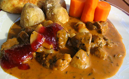 Ohjeet: Leikkaa paisti reiluksi kuutioiksi. Ruskista lihat pannulla parissa erässä. Sirottele jauhoilla. Lisää tomaattipyree. Mausta pippurilla, paprikajauheella, timjamilla, rosmariinilla. Siirrä lihat pataan. Hella puoliteholle. Hienonna sipuli ja kuullota voin kanssa pannulla. Mausta sokerilla ja siirrä pataan. Lorauta viini pataan. Lisää myös vettä niin että lihat juuri ja juuri peittyvät. Tiputa lihaliemikuutio sekaan. Hauduta liedellä kannen alla 1 1/2 tuntia. Leikkaa sienet reiluiksi paloiksi. Lisää hillosipuli (+loraus lientä), sienet ja kerma pataan. Hauduta pataa vielä puolisen tuntia. Maistele ja mausta. Kun pata on valmis, sekoita joukkoon vielä hienonnettu persilja |