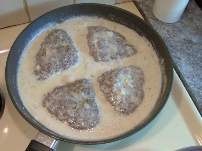 1. Sekoita jauhelihaan suola ja pippuri. Lisää muna, perunajauho ja maito. 2. Silppua sipuli ja sekoita se taikinaan. Tee taikinasta pannun kokoinen levy. 3. Paista pihvi toiselta puolelta ruokaöljyssä. Jaa pihvi neljään osaan, käännä ja paista toiselta puolelta. 4. Lisää kerma, vesi ja sinappi. Keitä hiljalleen 10 minuuttia. ![]() |