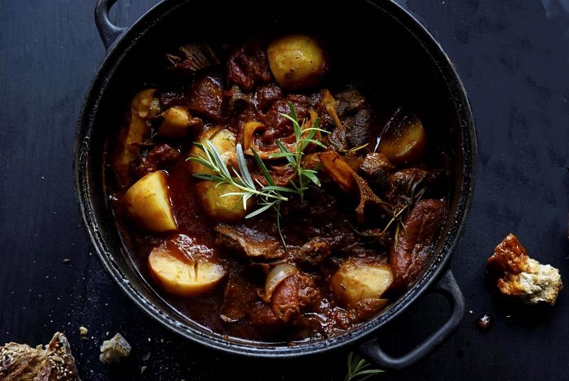 Laita uuni lämpiämään 175 asteeseen. Pese ja leikkaa paprika viipaleiksi. Kuori ja paloittele sipulit neljään osaan. Murskaa valkosipulin kynnet veitsen kyljellä ja kuori ne. Leikkaa lihanpalat keskenään suunnilleen saman kokoisiksi, isoiksi paloiksi (noin 7 senttiä halkaisijaltaan). Sekoita vasikkafondi kahteen desilitraan vettä. Kuumenna padassa oliiviöljy, nosta lihat pataan ja ruskista pinta kovalla lämmöllä. Ripottele päälle puoli teelusikallista suolaa. Nosta ruskistuneet palat sivuun ja nosta pataan sipulit ja paprikat. Ruskista niitä, kunnes ovat paahtuneet osittain tummanruskeiksi ja padasta nousee paahteinen tuoksu. Lisää joukkoon valkosipulit ja lihat. Lisää mausteet ja rosmariinin oksat. Pyörittele mausteita hetki padassa ja lisää vasikkaliemi ja tomaatit. Sekoita, laita kansi päälle ja nosta uuniin kahdeksi tunniksi. Kuori perunat valmiiksi ja puolita ne. Lisää perunat pataan, kun paistoaikaa on jäljellä 45 minuuttia. Tarjoa hyvän leivän kera. |