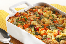 Kuumenna vesi kiehuvaksi, lisää makaronit ja keitä 7 minuuttia. Älä valuta. Sekoita jäiset kasvikset, valutettu ja paloiteltu tonnikala sekä vihersilppu joukkoon ja kaada seos voilla voideltuun uunivuokaan. Sekoita liemen ainekset ja valuta se makaroniseoksen päälle vuokaan. Paista 200 asteessa uunin keskiosassa noin 60 minuuttia. Peitä vuoka kannella tai alumiinifoliolla ja anna ruoan vetäytyä 15 minuuttia ennen nauttimista. Tarjoa juuresraasteen, vihreän salaatin tai etikkapunajuurilohkojen kanssa. |