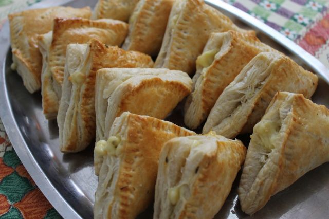 Sekoita ainekset ja jaa täyte voitaikinaneliöille, jätä vähän raakaa kananmunaa voiteluun; Käännä voitaikina kolmioiksi. Painele tiukasti kiinni ja voitele. 225 astetta 20 min.