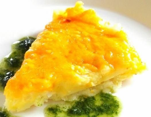 Kuori perunat ja leikkaa kuutioiksi. Keitä niukassa vedessä kypsiksi. Silppua sipulit ja kuullota voissa kypsiksi. Kun perunat ovat kypsiä, sekoita ne haarukalla karkeaksi muussiksi. Yhdistä perunat ja sipulit. Anna jäähtyä hieman. Sekoita joukkoon mausteet ja kaksi keltuaista. Levitä seos 30 cm -irtopohjavuokaan. Tasoita pinta, mutta älä painele seosta liian tiiviiksi. Ripottele pinnalle juustoraaste. Paista 225-asteisessa uunissa 15 min. Anna vetäytyä hetki ja tarjoile kauniina viipaleina. |