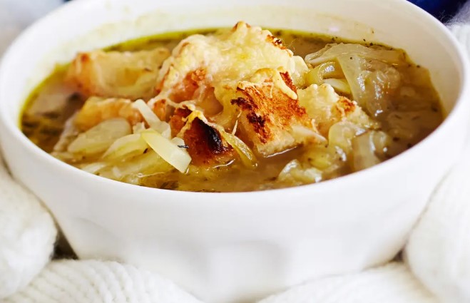 Kuori, halkaise ja leikkaa sipulit ohuiksi viipaleiksi. Kuumenna öljy kattilassa ja kuullota sipulia miedolla lämmöllä 15 minuuttia. Kiehauta 9 dl vettä ja lisää kaksi kasviliemikuutiota. Lisää hienonnettu valkosipulinkynsi, mustapippurirouhe ja kasvisliemi sipulien joukkoon. Anna keiton hautua noin 30 minuuttia. |