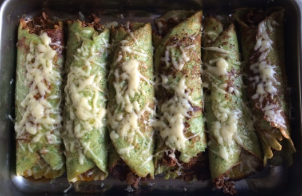 Laita täytettä kypsän letun päälle. Kääri rullalle ja aseta täytetyt letut uunivuokaan vierekkäin