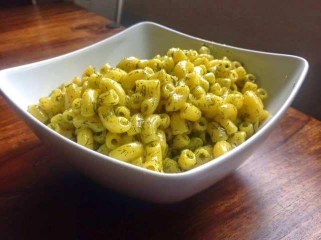 Ohje: Keitä makaronit, valuta ne ja laita takaisin kattilaan. Anna makaronien olla kylmässä vedessä n. 5-10 minuuttia välillä sekoittaen. Kaada vedet siivilän avulla pois, ja huuhtaise vielä kerran. Lisää tilli, aromisuola ja öljy |