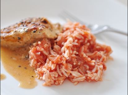 Keitä riisi tomaattimehun ja tomaattimurskan sekoituksessa, mausteena parikaa, sipulia ja suolaa. Näin saat mehukkaan ja kauniin värisen riisin tarjottavaksi lihan tai makkaran kanssa