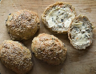 Ohje: 1. Sekoita isossa sekoituskulhossa kahdeksan desilitraa huoneenlämpöistä vettä, 30 grammaa tuorehiivaa ja ruokalusikallinen suolaa. Sämpylät ovat runsassuolaisia. Suolan määrää voi halutessaan vähentää. 2. Lisää puolitoista desilitraa siemeniä tai kaurahiutaleita, kaksi ja puoli desilitraa sämpyläjauhoja ja noin yhdeksän desilitraa vehnäjauhoja. Lisää jauhot desi kerrallaan ja sekoita puuhaarukalla. 3. Raasta 200 grammaa juureksia ja lisää ne taikinaan. Lisää joukkoon kaksi ruokalusikallista öljyä tai sulaa voita taikinaan. Taikina jää löysäksi. Sitä ei tarvitse vaivata, vaan sitko muodostuu itsekseen yön yli. Peitä kulho kelmulla tai kannella ja jätä yöksi jääkaappiin kohoamaan. 4. Kaada taikina aamulla työpöydälle ja nostele taikinasta 10 sämpyläkasaa leivinpaperin päälle. Jos haluat säännöllisiä sämpylöitä, ota avuksi vähän jauhoja ja muotoile löysä taikina palloiksi lastan avulla. 5. Ripottele päälle halutessasi siemeniä. Paista sämpylät 225 asteessa uunin keskitasolla 30–35 minuuttia. |